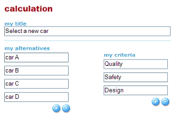 Under column „my alternatives“ we are putting the names of our alternatives. In our case we named our cars wit A, B, C, D. The order it is no relevant. If you wish to add more, simply click on + or if you would like to compare less alternatives just click on -.