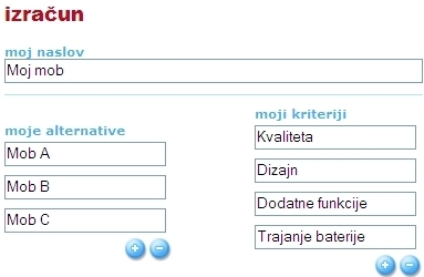 Krećem s upisom modela. Unosim naslov da si mogu snimiti varijantu kasnije i možda naknadno mijenjati ili nadopunjavati, pa da znam na što mi se odnosi. Pod „moje alternative“ unosim nazvive mobača, a u drugoj koloni kriterije.