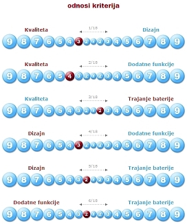 Dizajn mi je bitniji od dodatnih funkcija, jer mi je važnije imati praktičan i lijep mobitel, nego dodatne opcije koje rijetko ili nikad ne koristim. Iako mi je važno i trajanje baterije preživjet ću s nešto manjim trajanjem, ako mi je zato mobitel originalan i super dizajniran. Dodatne funkcije su mi malo bitnije od trajanja baterije. Pogledajte kako sam poklikala odnose medju kriterijima.