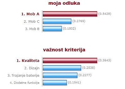 Ukoliko se sjetim još nekog kriterija kasnije, i procjenima da mi je isto tako bitan, jednostavno ću ga kasnije dodati u model, uspostaviti odnose među drugim kriterijima i uspoređivati modele mobitela i po njemu. Zgodno je ovo pohranjivanje izračuna jer ne moram sve ispočetka.